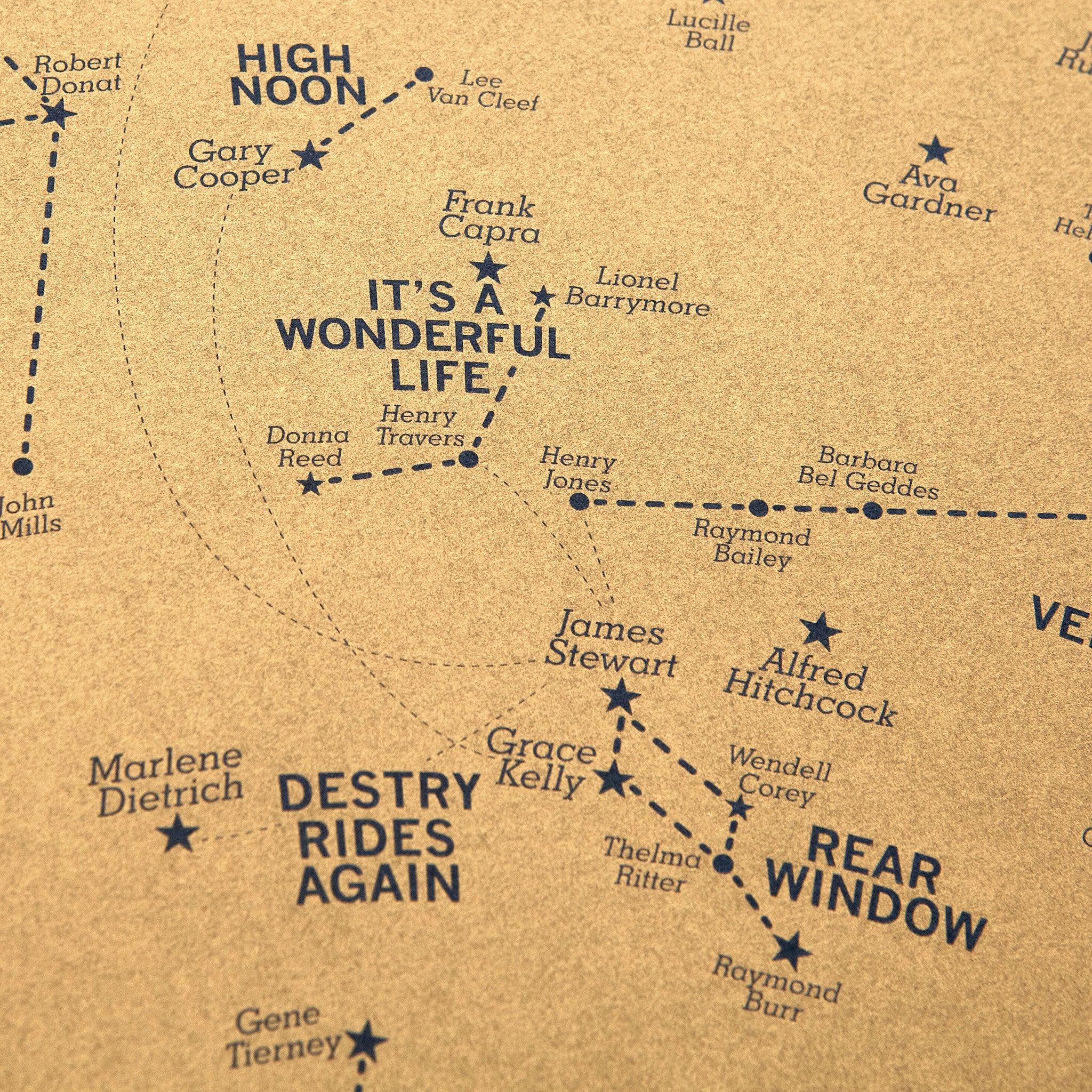 The Golden Age version of our Hollywood Star Chart features constellations named after some of the most culturally significant films to have appeared on the silver screen between 1927 and the 1960's. The stars that make up the clusters are the Hollywood actors who appeared in those movies.