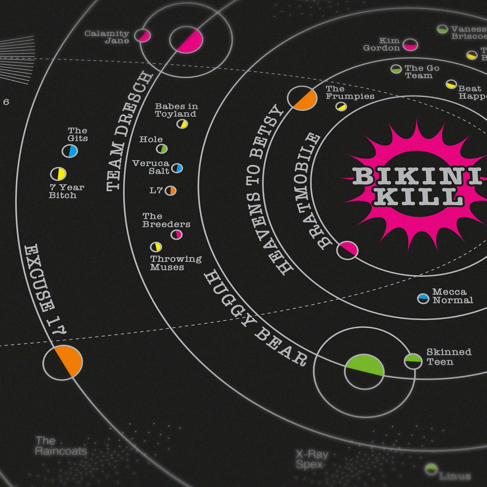 The print also features female musicians and bands who, although not part of the original scene, shared similar outlooks by making music on their own terms including punk pioneer Patti Smith, Kim Gordon (Sonic Youth), L7, Hole, The Breeders and Throwing Muses along with early British female-fronted punk bands like X-Ray Spex, The Slits, and The Raincoats, post-punk's Siouxsie and the Banshees and PJ Harvey..