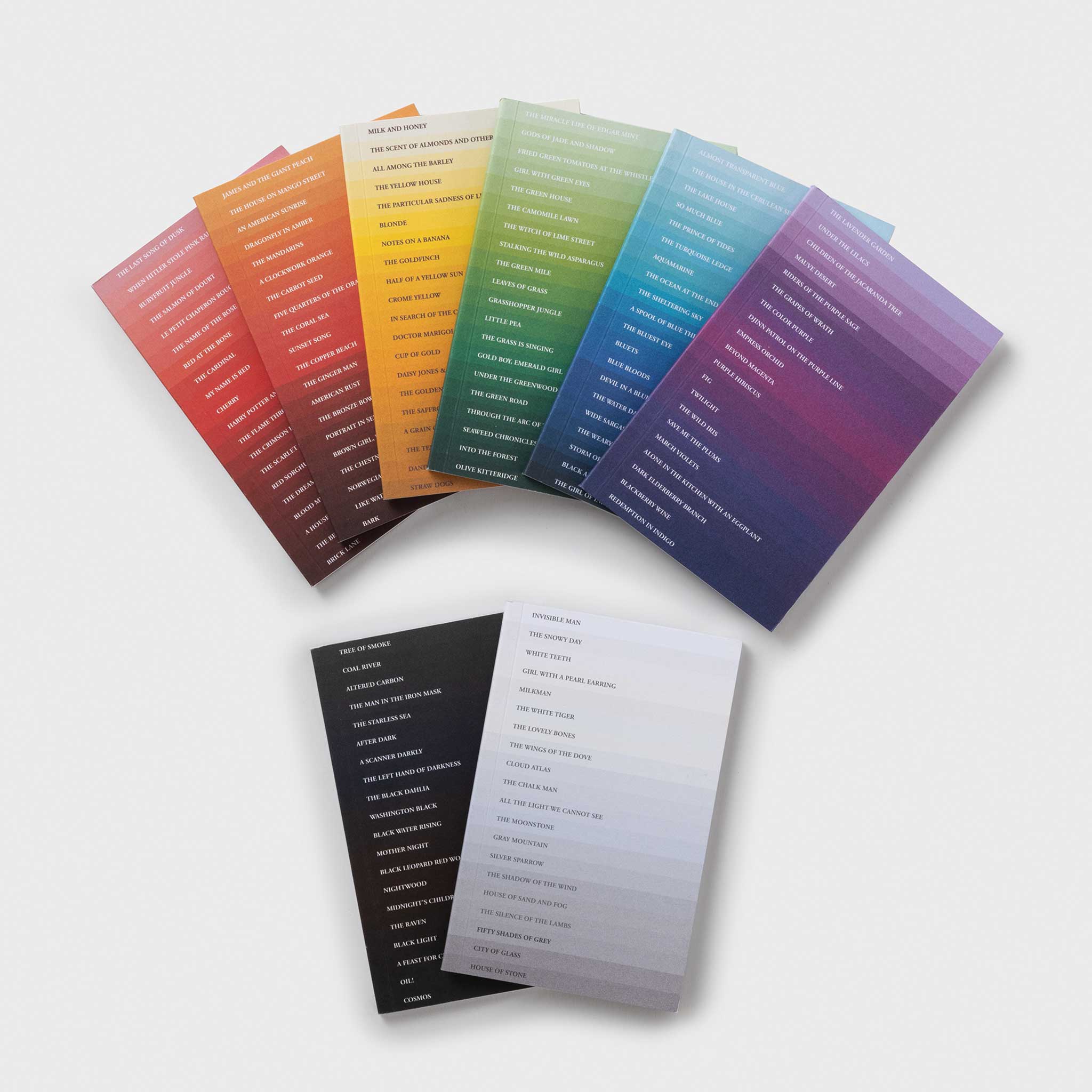 Other titles across the colour spectrum include White Teeth, The Name of the Rose, The Goldfinch, Half of a Yellow Sun, The Yellow House and Like Water for Chocolate, with 160 total book titles featured across the eight notebook covers.