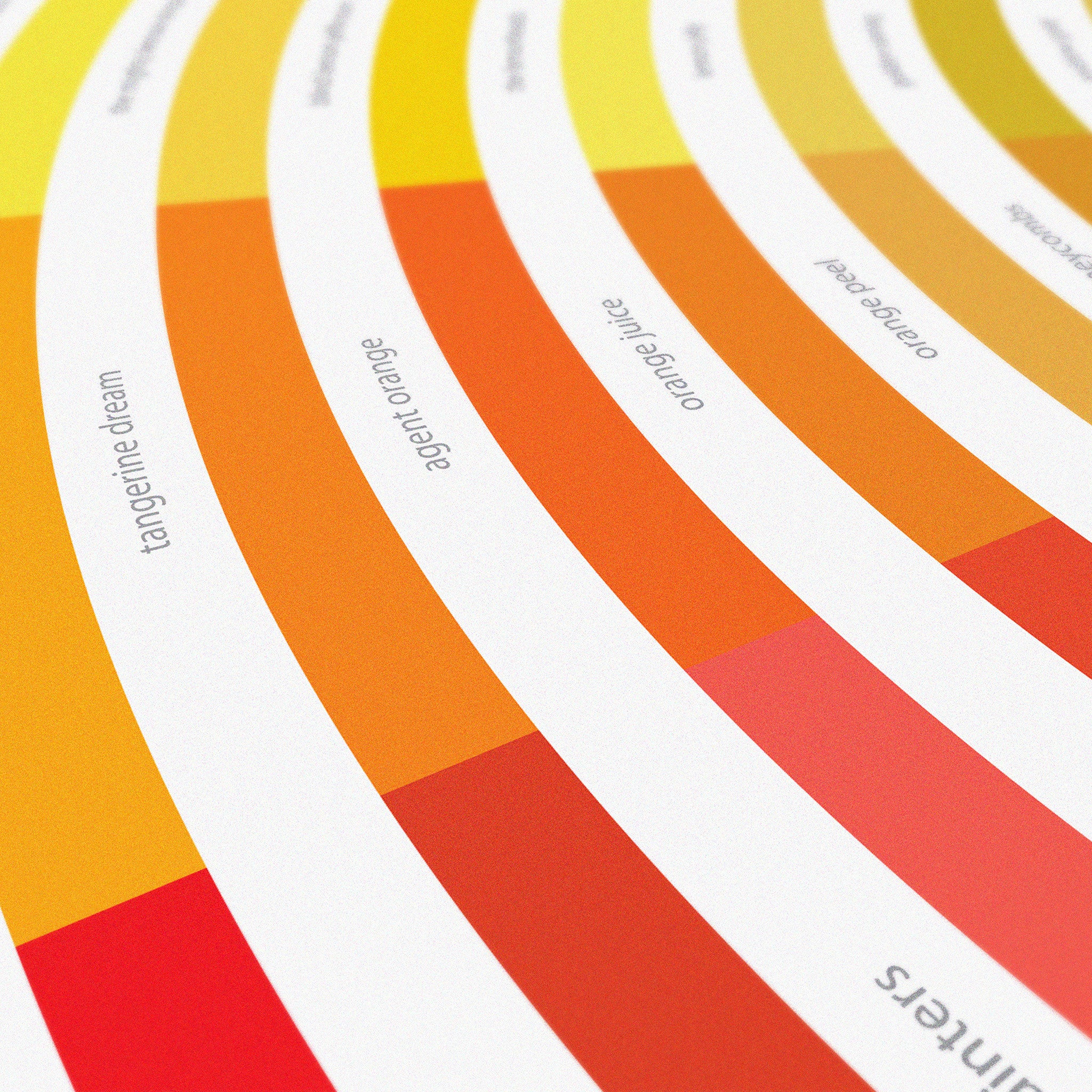 A stylised colour wheel featuring the names of 154 bands (and artists) with a colour in their title. From the obvious Black Sabbath, Pink Floyd, Deep Purple, Blondie, James Brown, King Crimson, Neneh Cherry, The Stone Roses and The White Stripes to the more obscure (but not forgotten) Silver Apples, Black Flag, Mudhoney, The Red House Painters, White Denim and The Green Telescope, plucked from the depths of our well thumbed vinyl collection.