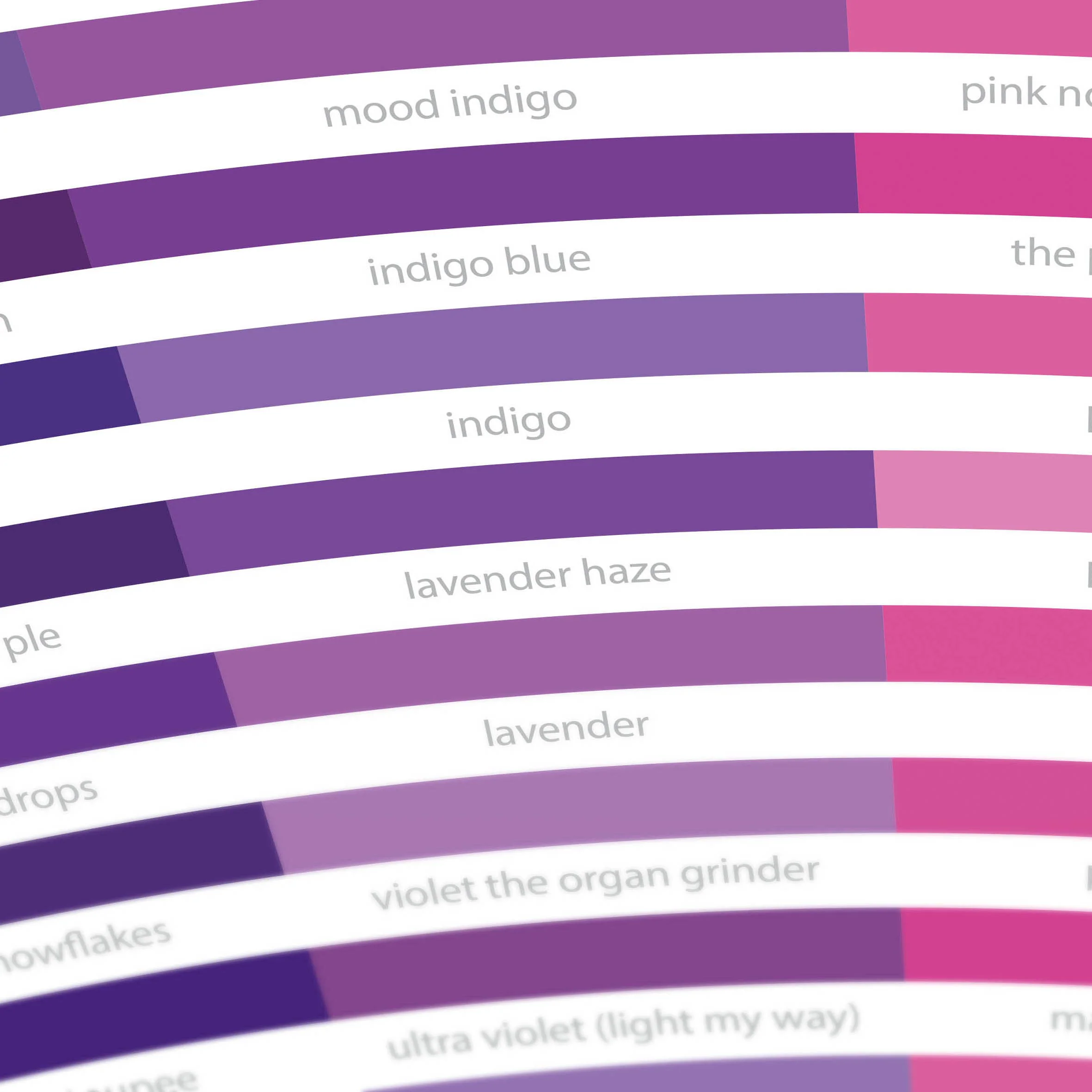 A stylised colour wheel featuring the titles of 576 tracks that include a colour in their title. Including classics like Pale Blue Eyes, Yellow Submarine, Purple Rain, Back to Black, Brown Sugar, Blue Monday, Fools Gold, Blackstar, Lavender Haze and some guilty pleasures like Mr. Blue Sky, Goldfinger and (for children of the 80s) Pretty in Pink.