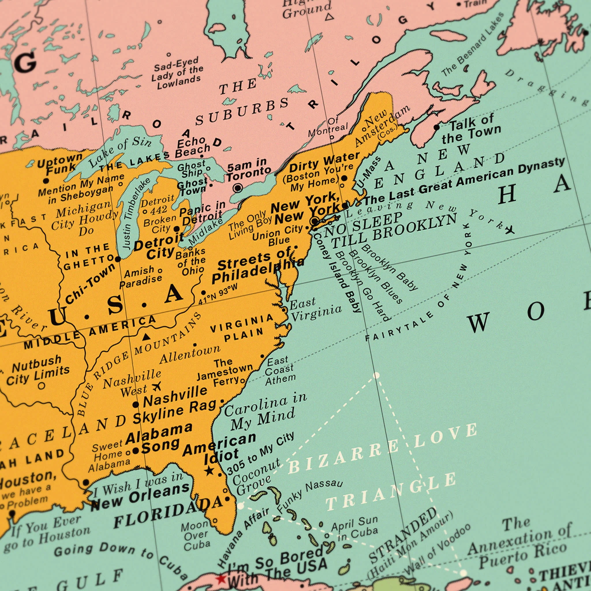 The Map, which is based on the style of a vintage 1950s world wall chart features obvious classics such as Born in the U.S.A. (Bruce Springsteen), Back in the U.S.S.R. (The Beatles), Anarchy in the U.K. (Sex Pistols), China Girl (David Bowie), New York, New York (Frank Sinatra), Radio Ethiopia (Patti Smith) and Radio Free Europe (R.E.M), plus cult classics and some of our own personal favourites such as Trans Europe Express (Kraftwerk), No Sleep till Brooklyn (Beastie Boys), London Calling (The Clash), Town Called Malice (The Jam), Hong Kong Garden (Siouxsie and the Banshees), Fake Tales of San Francisco (Arctic Monkeys), Hit the North (The Fall) and Afrika Shox (Leftfield) and Welcome to My Island (Caroline Polachek).